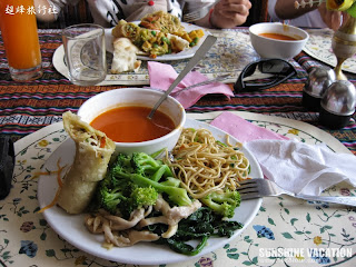 當天下午的行程,原本就是安排大家在飯店裡好好休息。為的就是讓大家能慢慢適應這高海拔的地區,所以大家下午的時間幾乎都在房裡打坐、靜心或休息。可是到了晚餐時間,開始有更多的人紛紛感受到高原反應是怎樣的一種症狀。一時間也難以敘述,有些人的高原反應症狀還蠻像感冒時產生的發燒症狀、或四肢無力。而我的高原反應則是嘔吐,根本連房門都沒法踏出,只能躺著,一坐起身就想吐~~所以只能在床跟廁所間奔波著,根本無法前去餐廳用晚餐。
